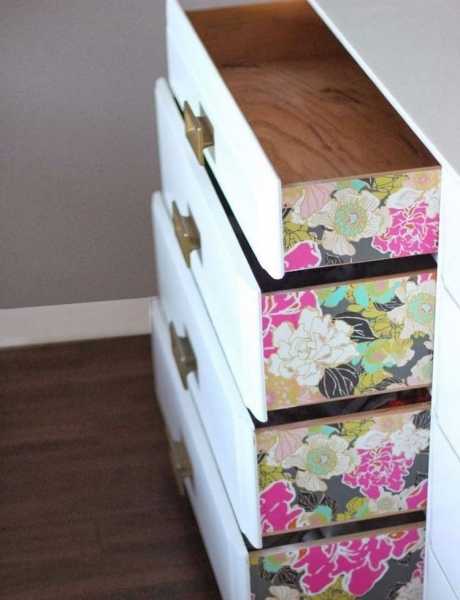 Куда безопаснее украшать обоями мебель. Например, внутреннюю часть выдвижных ящиков или стеллажей.