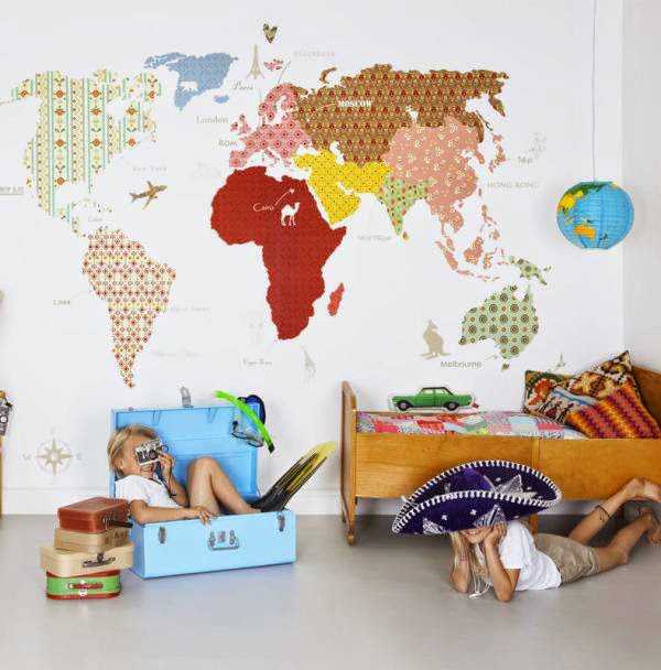 Ярко, весело и познавательно — вырезанные из разноцветных обоев материки и острова. Можно вырезать разных животных и с ребенком вместе поместить их на нужные материки. Можно подписать каждый из них, а так же основные столицы или города. Можно ставить флажки там, где вы уже успели побывать. Замечательное украшение и развлечение для детской комнаты.