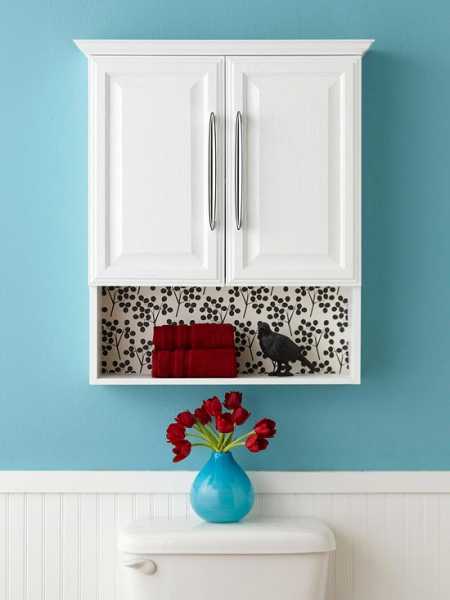Использовать для этих целей нужно не те обои, которыми обклеены стены этого помещения, а остатками из другой комнаты. Тогда в дизайне будет выделяться новый рисунок, который придаст особую изюминку в оформлении.