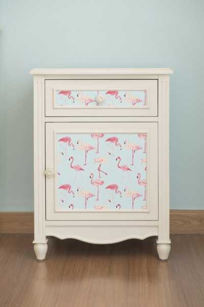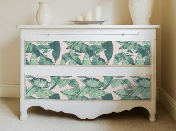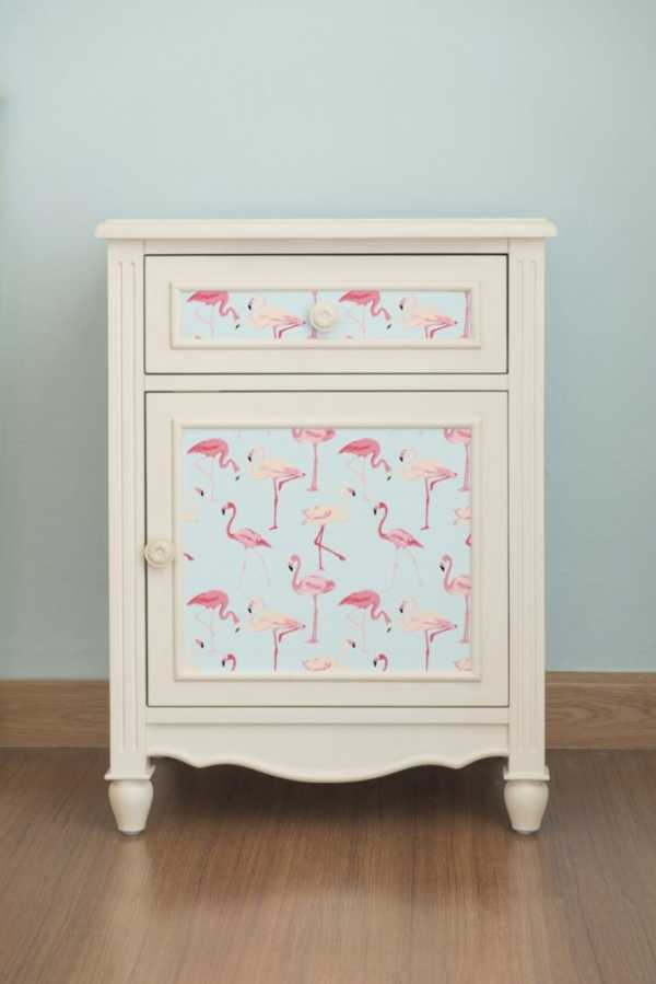 Такой вариант подойдет для тумбочек, столиков, комодов. Виниловые обои прослужат долгое время, а бумажные лучше после наклеивания порыть лаком.