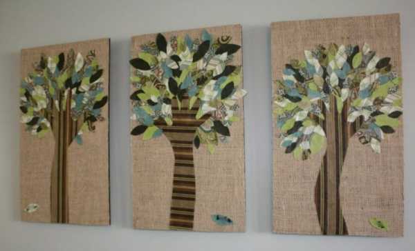 Для их создания понадобятся, кроме самих остатков обоев, обычный клей, клей для рамы, деревянные или пластиковые планки. Куски из обоев наклеивают на стену, а затем делают обрамление.