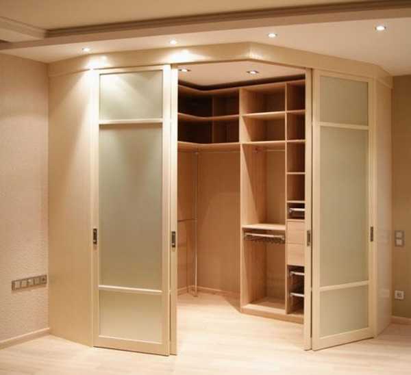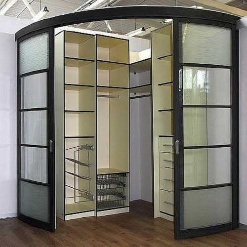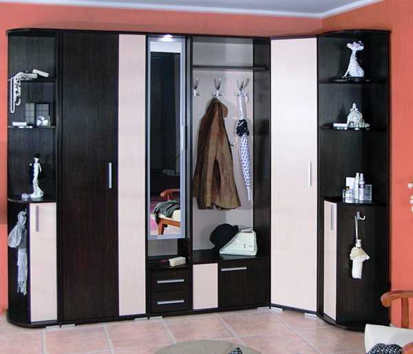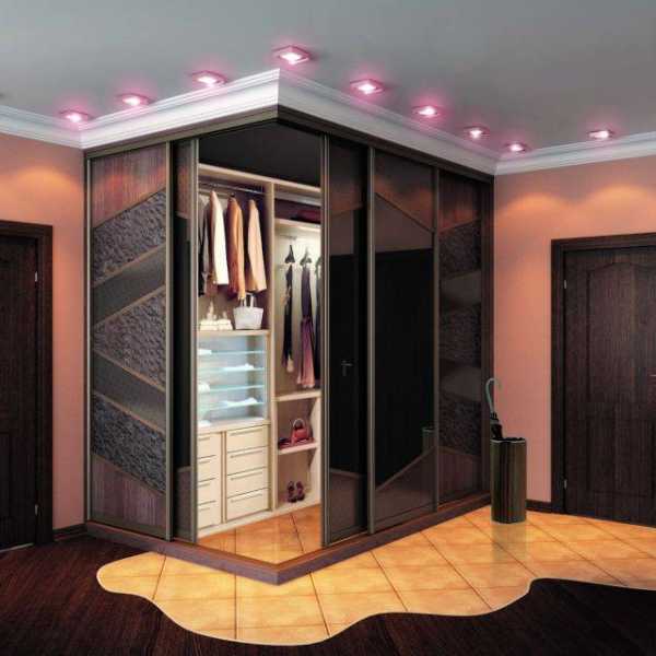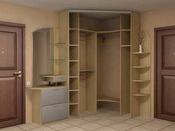 - очень полезной считается угловая гардеробная в коридоре, если он имеет квадратную форму. Особенно хорошо применять такой тип структуры мебели, если угол находится между двумя дверьми. Это позволит избежать создания препятствия на проходе од оного проема к другому;