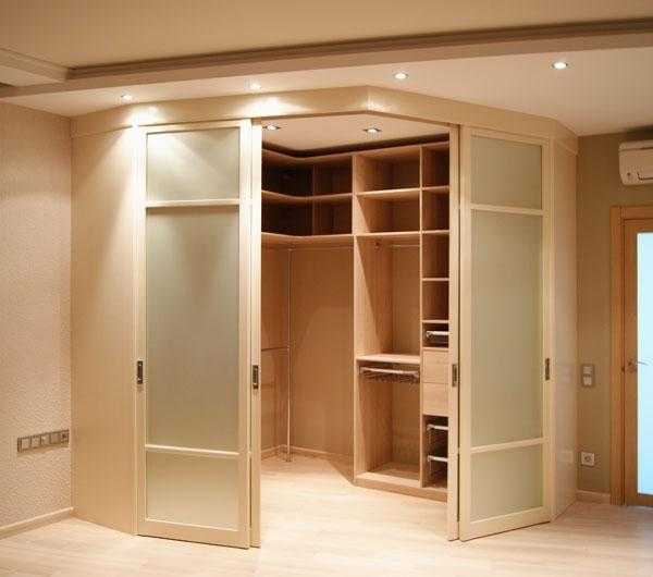 Также можно классифицировать встроенные гардеробные по типу дверей, месту расположения в комнате: