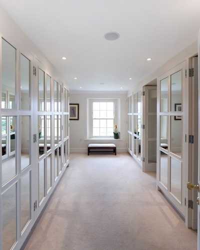 - А чтобы гардеробная была по-настоящему удобным и полностью функциональным местом в доме идеально дополнить её пуфом и большим настенным или напольным зеркалом.