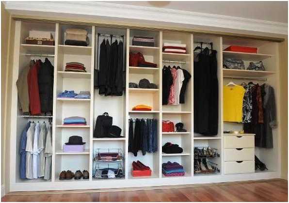 - Должны быть полки для сложенной одежды. Повседневные вещи лучше складывать на местах доступных без труда. Нижние или верхние полки лучше использовать для хранения несезонной одежды или вещей, которые достаются редко.