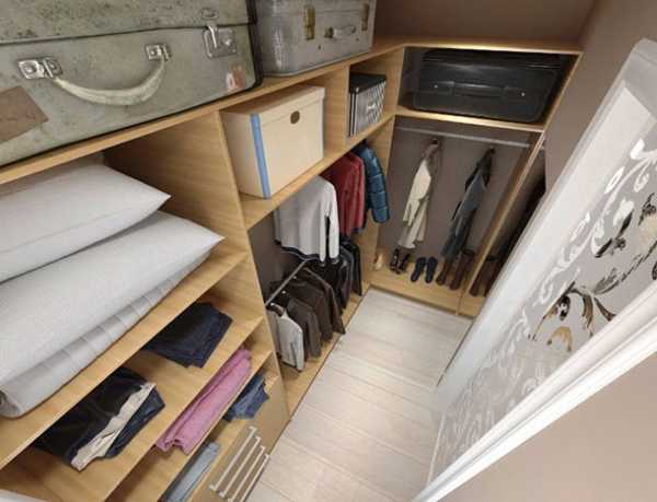 - Спланировать гардеробную и выбрать оборудование для внутреннего наполнения вы можете индивидуально в зависимости от имеющихся условий. Например, использовать незадействованное пространство в доме под лестницей или часть коридора.