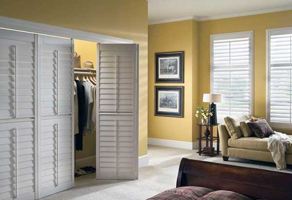- распашные двери в гардеробной могут применяться в случае, если нет возможности установить раздвижные двери. Несмотря на свою незаурядность, такой тип дверей может быть очень полезным, если установить на их внутреннюю сторону полки для мелких аксессуаров или оснастить небольшой вешалкой. Очень интересным дизайнерским решением могут стать жалюзийные двери, которые также обеспечат необходимую вентиляцию внутри конструкции;