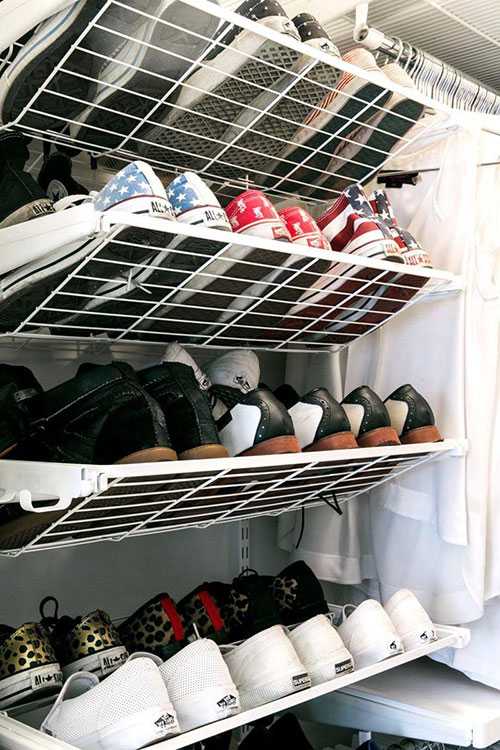 - Обувь в гардеробной должна храниться в специализированных обувницах или коробках, которые лучше подписать, чтобы упростить поиск нужной пары.