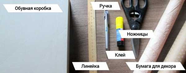 Потребуется: коробка из-под обуви, линейка, ручка, клей, ножницы и бумага для декора.