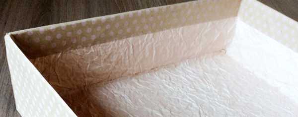Не приклеивайте бумагу без «примерки» — это чревато ошибками и неровностями. - Загните бортики — так будет удобнее. Сделайте надрезы на линиях сгиба в уголках коробки, чтобы бумага легла ровно.