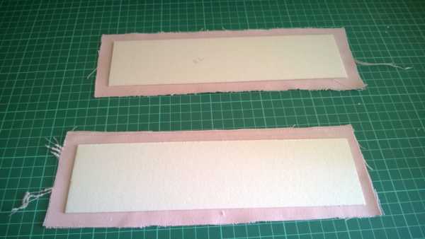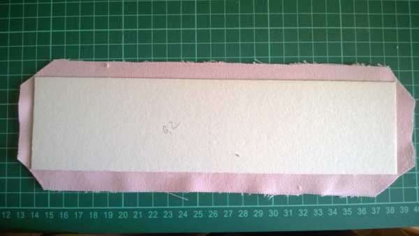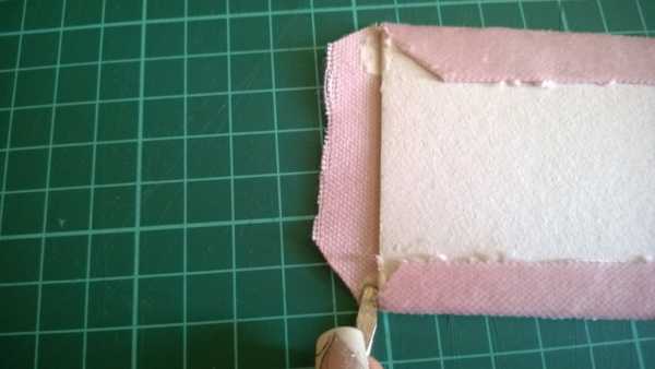 Натягиваем ткань. Можно сперва приклеить на клей карандаш синтепон, а потом ткань, а можно нанести пва на картонку, приклеить ткань, затем сперва длинные стороны, потом короткие. Я выбрала 2 способ.