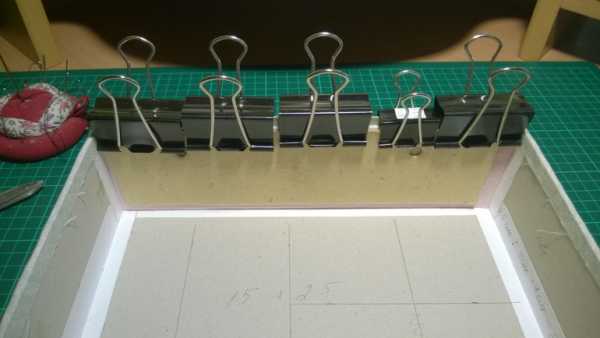 Приклеиваем края ткани к картону, примеряем будущую стенку, и, если все в порядке, вклеиваем стенку в коробку. Верхние края я обычно промазываю «Кристаллом», чтобы не отходили (т.к. ПВА ткань к ткани не приклеивает). Затем, подложив тряпочку (чтобы не оставить следов), прижимаем прищепками нашу стенку по верхней кромке: