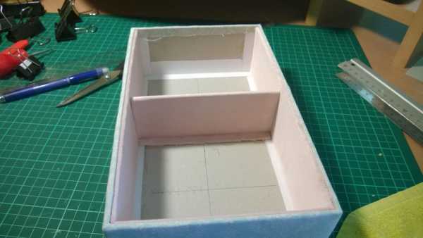 Теперь на намеченную линию приклеиваем перегородку. Аккуратнее с клеем, постарайтесь не вымазать верхние края коробки (на другие нам все равно, мы их потом оклеим).