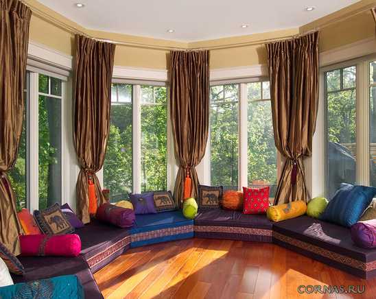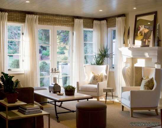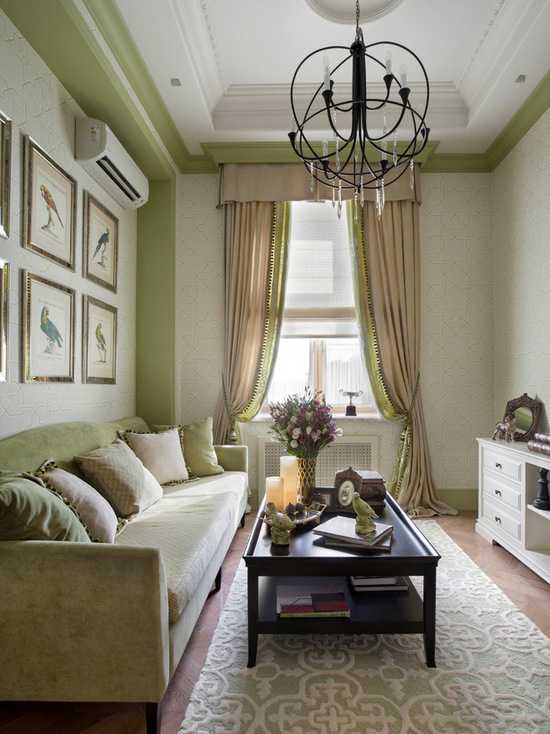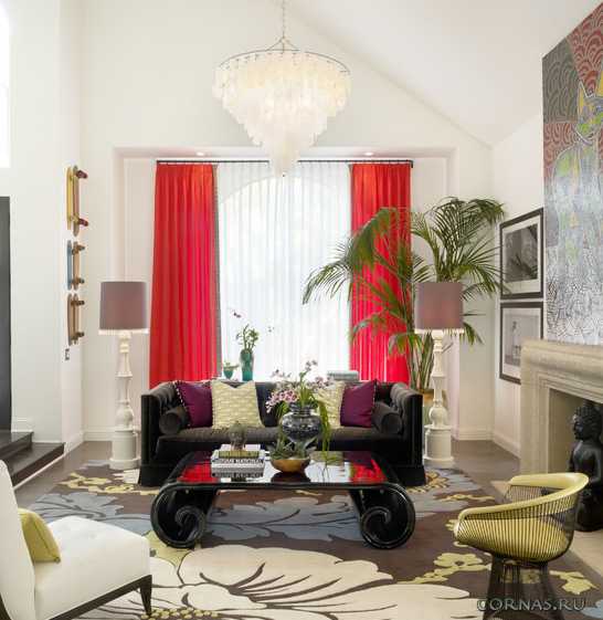 Поразительный эффект достигается путём дополнения интерьера цветастыми занавесками. Подбирая шторы, главное, добиться чтобы они не сливались со стенами. Лучше выбрать двухцветную ткань. Если портьеры подбираются под обивку мебели, то этот вариант очень экономичный, поскольку мебель меняется не каждый год.