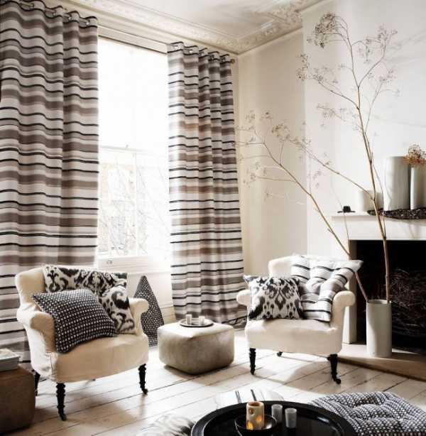 Шторы с вертикальной полоской зрительно вытянут помещение вверх. Так, если хочется подчеркнуть очень высокий потолок или стрельчатые окна — это хороший прием