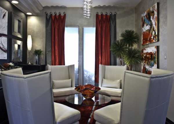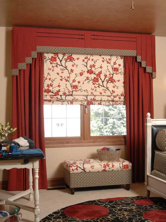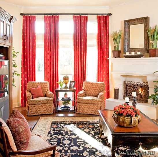 Выбор цвета штор: шторы красного цвета. Красный цвет в интерьере для штор в естественном виде применяется не часто из-за своей яркости. Большое количество красного подавляет, да и к тому же зрительно делает помещение меньше. А вот его сочетание с теплыми оттенками прекрасно подойдет для зала.