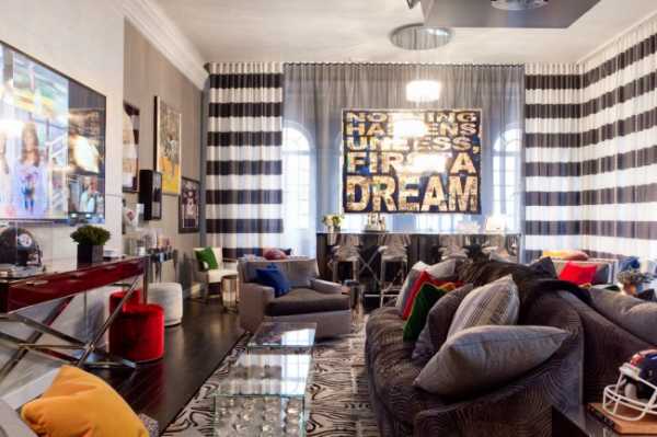 Широкая горизонтальная черно-белая полоса в эклектичном интерьере в доме молодых людей