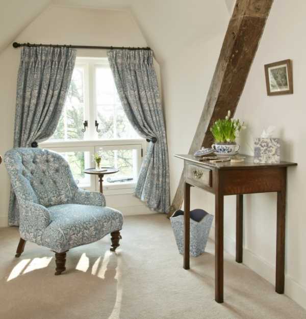 Кресло и гардины в одном и том же цветочном рисунке в интерьере стиля кантри