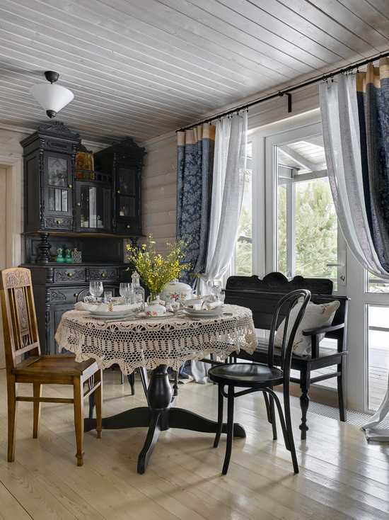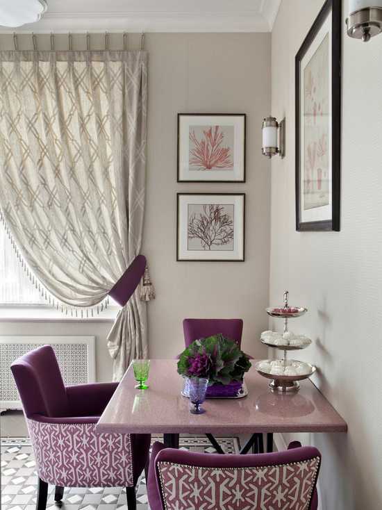 В тон подбирают скатерть на стол, или подушки на диван. Для кухни обычно подбирается цвет занавесок, гармонирующий с цветом кухонной мебели или столешницы.