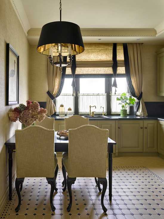 - на кухне если и используются обои, то максимально светлые и нейтральные. В такую обстановку отлично вписываются яркие шторы с тематическим рисунком, узорами. Хорошо тут смотрится клетка, полоска, горошек, цветочный орнамент и т.д., но будьте осторожны с темными оттенками;