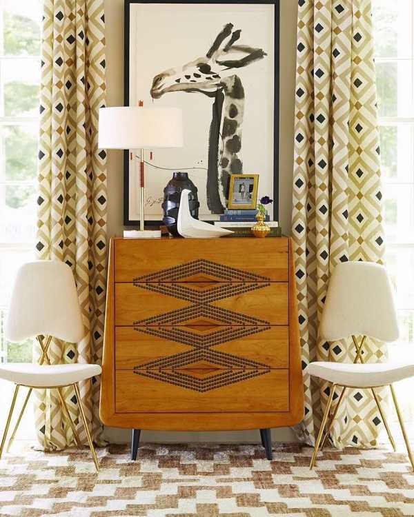 Шторы с геометрическим рисунком лучше сочетать с однотонными обоями. Конечно же, вполне допускается использование обоев с геометрическим орнаментом, причем не обязательно с точно таким же, как на шторах, но при сочетании этих рисунков нужно быть очень осторожным, чтобы не превратить помещение в безвкусное.