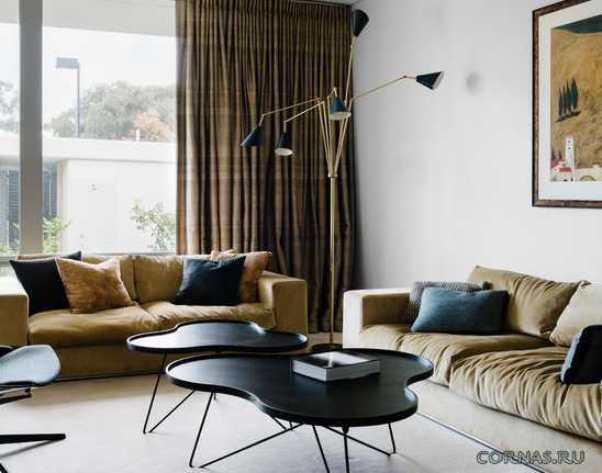 Оригинальности интерьеру придадут асимметричные шторы, одна сторона которых короче другой. Такие портьеры оживляют обстановку.