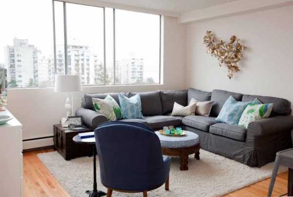 Планировка гостиной с угловым диваном и отдельным креслом