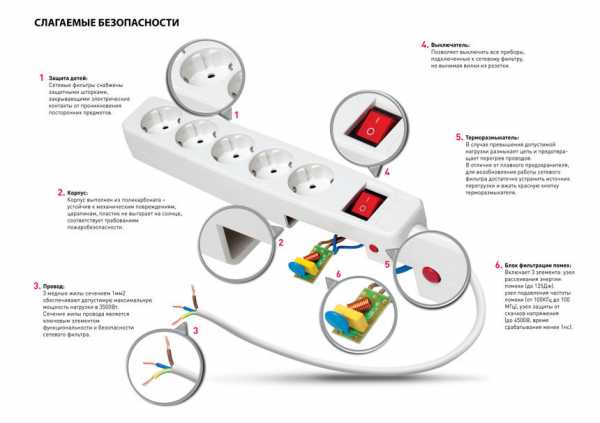Важной особенностью использования удлинителя для питания электроники является наличие сетевого фильтра и кнопки для отключения из сети. Сетевой фильтр — это устройство для подавления электромагнитных помех, создаваемых вашим оборудованием в питающей сети. Их возникновение обусловлено принципом работы импульсных преобразователей и рассматриваться в пределах этой статьи не будет.