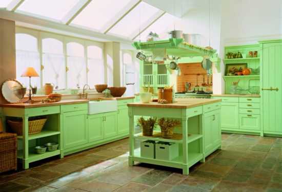 Также как и синий, зеленый цвет имеет множество оттенков. В шикарных современных кухнях прекрасно смотрится лаймовый и оливковый цвета. Пастельный светло-зеленый придаст шкафам винтажный вид. Да интерьер в стиле ретро не обойдется без зеленых оттенков.