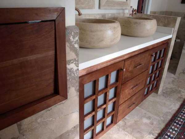 Из-за большой стоимости деревянные раковины и консоль менее распространены, хотя в интерьер ванны вписываются на отлично и выглядят нестандартно. С помощью специальных обработок и пропиток дерево становится похожим на пластик. Выбирая, нужно помнить, что в обращении такие раковины требуют большой осторожности.