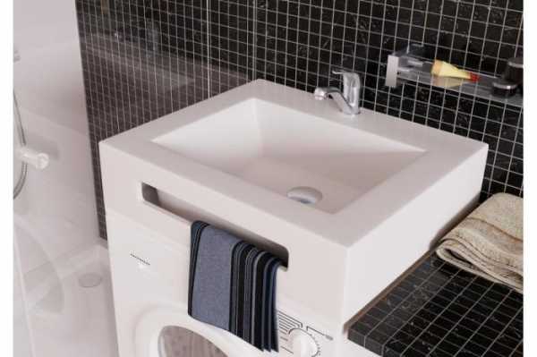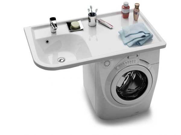 Отдельно стоит сказать о еще одном типе, который будет интересен для владельцев малогабаритных ванных комнатах. Это умывальники, устанавливаемые над горизонтальными стиральными машинами. Они имеют габариты верхней панели стиральной машины и небольшую глубину.