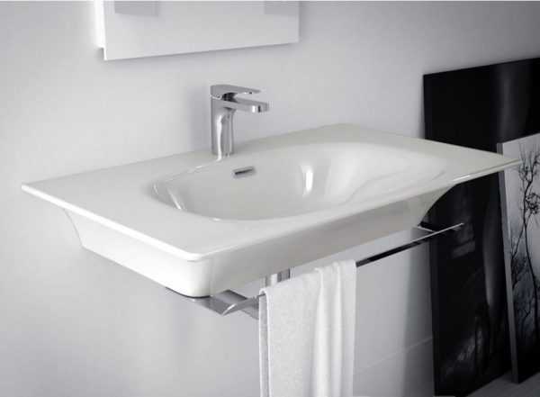 Владельцы больших и просторных ванных комнат отдают предпочтение встраиваемым моделям, которые врезаются в столешницу тумб. Сама тумба является не только деталью интерьера, но и скрывает канализационное колено и является удобным местом для хранения моющих средств и ванных принадлежностей.