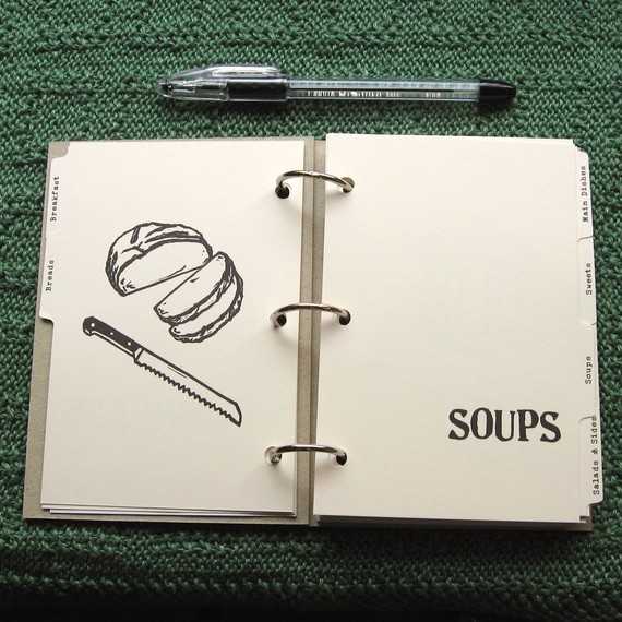 Отличной выбором станет книга рецептов на кольцах. Здесь уже можно пофантазировать и придумать фишки. Например, использовать разделители, которые помогут найти блюдо по категории: первые блюда, вторые, напитки, закуски и так далее.