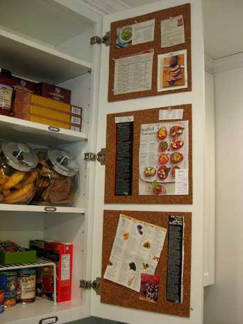 7. Это просто замечательная идеи — использовать внутреннюю дверку кухонного шкафа! Повесьте несколько корковых досок на дверку и используйте их для хранения рецептов. Как сделать такую корковую доску — читаем тут.