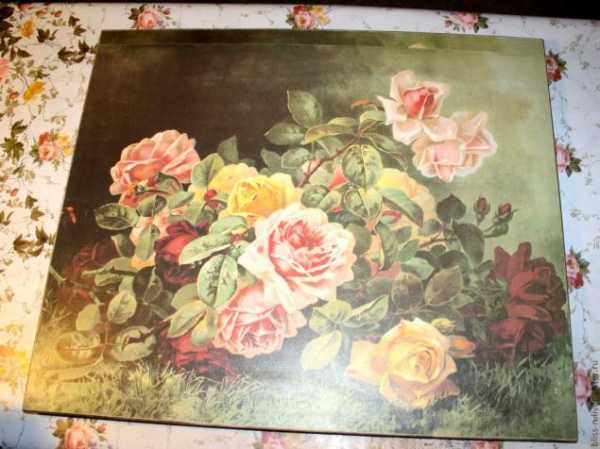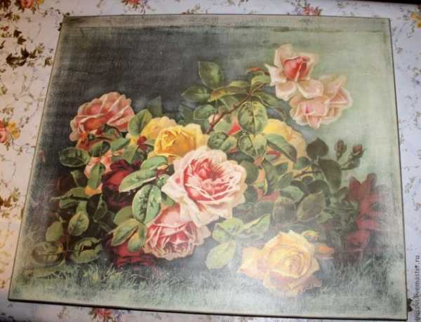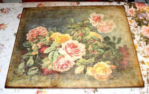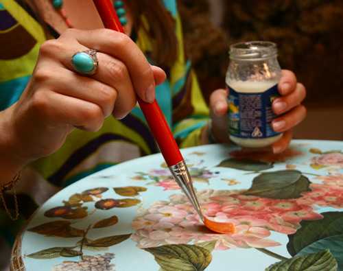 На следующий день результат закрепляют акриловым лаком, который наносят 3-5 раз с обязательными промежуточными просушками. Если вы заметили, что лак лег неровно, а в некоторых местах образовались наслоения, то эта неприятность устраняется наждачной бумагой, смоченной в воде. После чего поверхность снова покрывается лаком. Для данной цели очень удобно использовать аэрозольный лак, его распыляют тонким слоем на расстоянии в 30-40 см от поверхности. Если наносить сразу толстый слой лака, то появятся потеки и пузыри, что крайне нежелательно. Для того чтобы избежать залипания форсунки пульверизатора, в конце работы переворачивают баллончик кверху дном и нажимают на помпу до тех пор, пока остатки лака не распылятся полностью. Борта столика можно украсить тесьмой для отделки мебели, шнуром с кисточками или бахромой. Приклеивают декор при помощи клеевого пистолета.