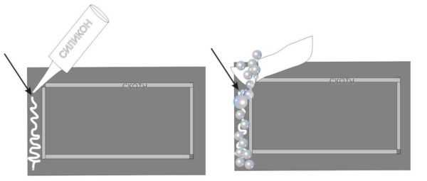 На отделенный участок зеркальной поверхности змейкой наносим силикон. За один раз намазываем небольшой кусочек — прядка 5 см. Быстро распределяем клей по всей поверхности. Сделать это можно кусочком от пластиковой бутылки. На лист бумаги насыпаем бисер, и с него рассеиваем по клею. Расправляем кисточкой, зубочистками. Пальцами не стоит — тяжело отмывать. Наносим клей дальше, продолжая декорирование. Как только обошли все по контуру, снимаете скотч и оставляете сохнуть.