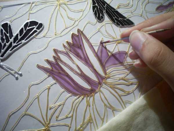 Далее контур должен просохнуть. Для этого требуется несколько суток, а ускорить процесс можно при помощи обычного фена (не строительного). После того как контур высох, берем витражные краски, заливаем из понемногу в контур, разносим кисточками, поправляем зубочистками — чтобы внутри контура не оставалось непрокрашенных мест. После того как витражные краски высохнут, они становятся прозрачными. Если есть желание, добавить гламура можно при помощи глиттера — блесток.