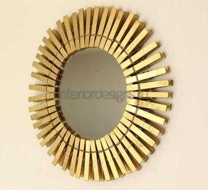Очень необычно в любом интерьере смотрится зеркало-солнце. Для его изготовления понадобятся деревянные брусочки (веточки деревьев), оправа из фанеры по размеру изделия, грунтовка, клеевой пистолет, клей по дереву, аэрозольная краска, наждачная бумага.