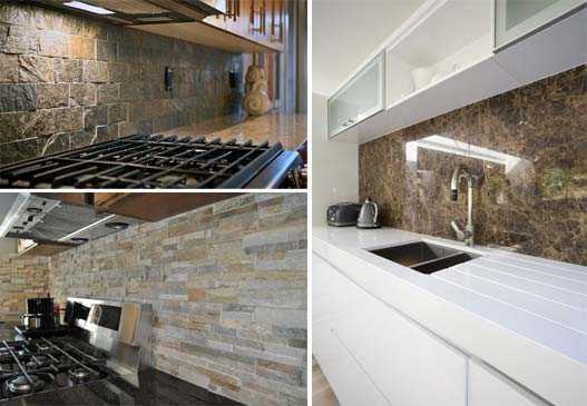 Современный интерьер все чаще включает в себя использование камня, поверхность которого либо матовая, либо глянцевая. Можно отделать фартук натуральным камнем или выбрать искусственный камень как более бюджетный вариант. Фартук из этого материала можно сделать как в виде монолитной конструкции, так и в виде сборной. Бывают варианты оформления каменного фартука в комбинации со стеклом, при котором стекло может быть расположено поверх камня. Этот материал имеет большой вес, поэтому особое внимание должно быть уделено его креплению к стене, при этом может использоваться специальный клей в сочетании с анкерными креплениями. Выгодно смотрится сочетание каменной столешницы с фартуком из такого же материала, цвета и текстуры. Отделать рабочую зону таким образом будет недешево, однако, выглядеть такая кухня будет весьма презентабельно.