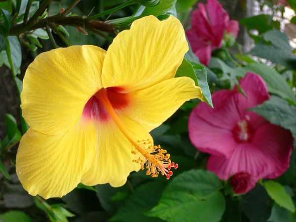 Гибискус – великолепное растение с крупными яркими цветками. О безопасности гибискуса убедительнее всего говорит то, что его лепестки заваривают в чай, а молодые листья едят. Гибискус любит яркое освещение, летом и весной его нужно прятать от прямых солнечных лучей. Полив обильный, осенью и зимой умеренный. Зимой у гибискуса период покоя, который ему лучше провести в прохладном месте.