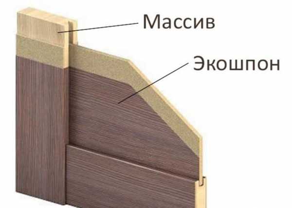 Экошпон представляет из себя пластик без примесей вредных веществ с содержанием древесных волоконШпон – это дорогое натуральное покрытие из различных пород дерева, полученное особым способом распила. Внутреннее наполнение при этом может быть из бюджетных пород дерева или ДСП.Шпонированное дверное полотно имеет привлекательный внешний вид, вполне может заменить полотно, полностью изготовленное из натурального дерева ценных пород, но оно дорогостоящее, и подходит скорее, как межкомнатная дверь, но не в ванную комнату.