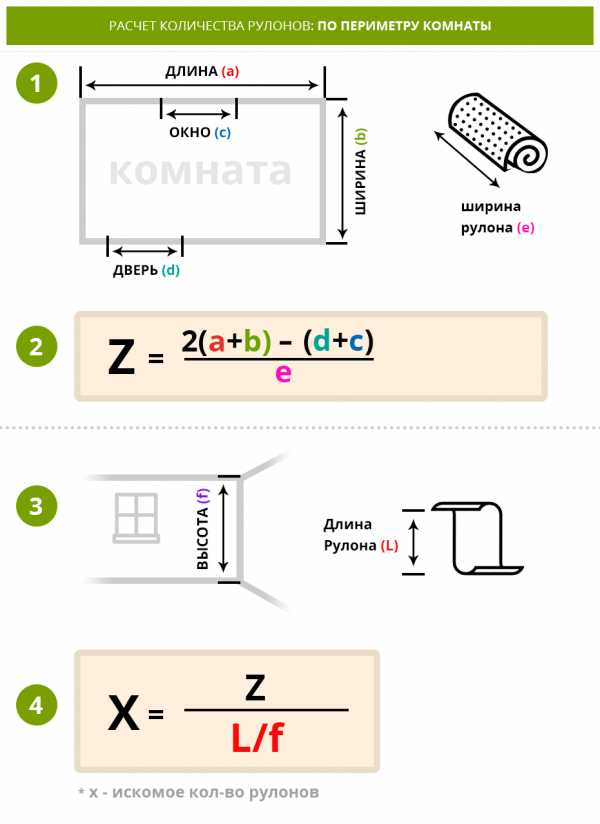 - По периметру комнаты. Нужно определить периметр, вычесть ширину оконного и дверного проемов, разделить это число на ширину вашего рулона обоев и полученный результат округлить в сторону большей величины. Затем нужно разделить это число на число полос в рулоне (чтобы его узнать, разделите длину рулона на высоту потолка) и вновь округлить. Так мы получим нужное количество рулонов.