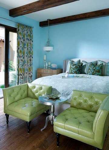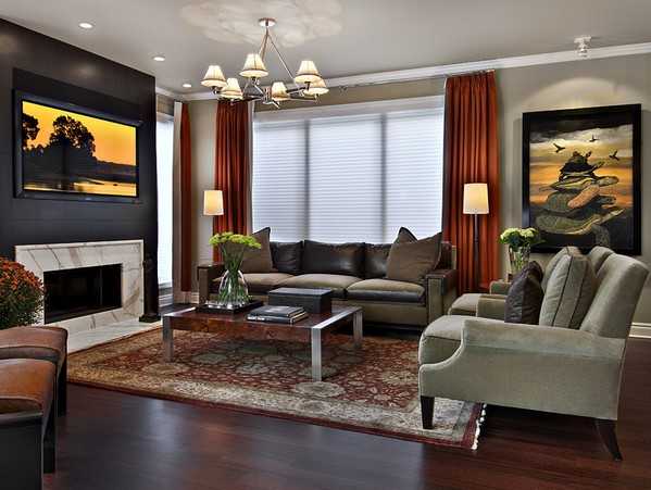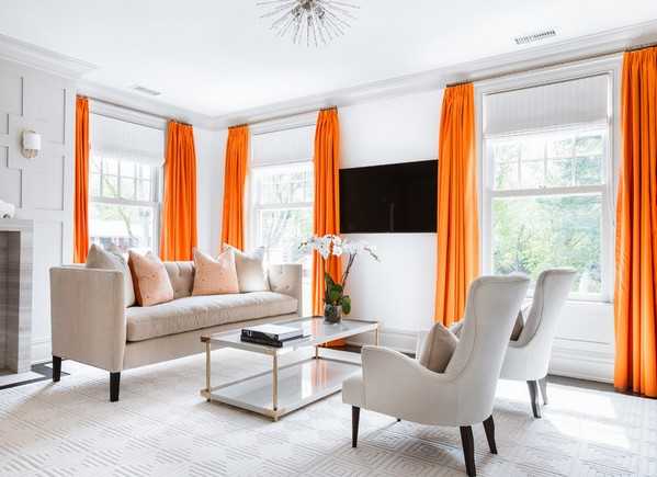 Этот план особенно хорош для спокойных и тем более скучных интерьеров. Контрастные шторы — красноречивый штрих, волшебным образом преображающий обстановку.