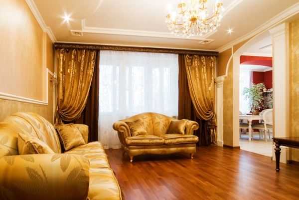 Создавая классический стиль интерьера в гостиной, подбирайте для штор более дорогой и эстетичный материал. Например, бархат и шелк. Торжественность гостиной придаст ламбрекен в дополнение к шторам и изысканный тюль с классическим рисунком. Для городского стиля характерными станут шторы нейтральных цветов. Можно выбрать и шторы с рисунком в клетку или полоску. Модными на сегодня являются римские и японские шторы. Но они больше подходят для больших гостиных в стиле минимализм или в восточном стиле. Также для «восточных гостиных» подойдут легкие шторы из органзы.