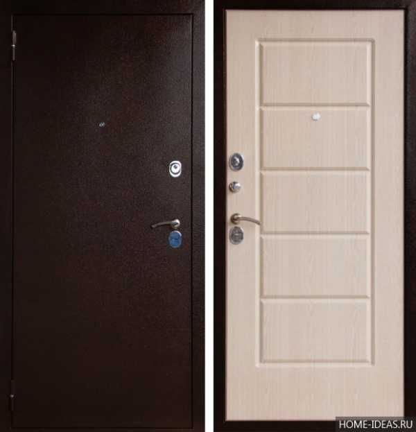 - Стальные двери, часто с термонапылением – наиболее популярны среди покупателей. Их конструкция должна обеспечивать стойкость к физическим воздействиями (удары, взломы и т. д.). Конструкция таких дверей включает два листа легированной стали от 1.5-2 мм до 3-4 мм толщиной. Более тонкий металл без проблем можно будет вскрыть, более толстый будет придавать излишний вес. Хорошая дверь усиливается ребрами жесткости, которые не дают стальным листам прогибаться и обеспечивают надежную внутреннюю фиксацию замков.