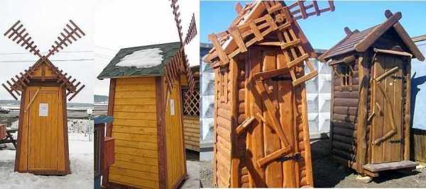 Дачный туалет в виде мельницыТакже в последнее время становится популярным биотуалет. На даче он может быть расположен в пристройке к дому, в кладовом помещении, в хозпостройке. Преимущество такого туалета в отсутствии неприятного запаха.