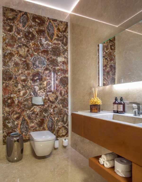 Удачно обыгранный светом камень удивляет своим объемом и величественным видом. А если еще он размещен в туалете.. Отметим скрупулезную работу со светом в этом помещении: точечная подсветка в качестве базового освещения, а в помощь ей еще и протянуты вместо плинтусов светодиодные полоски.