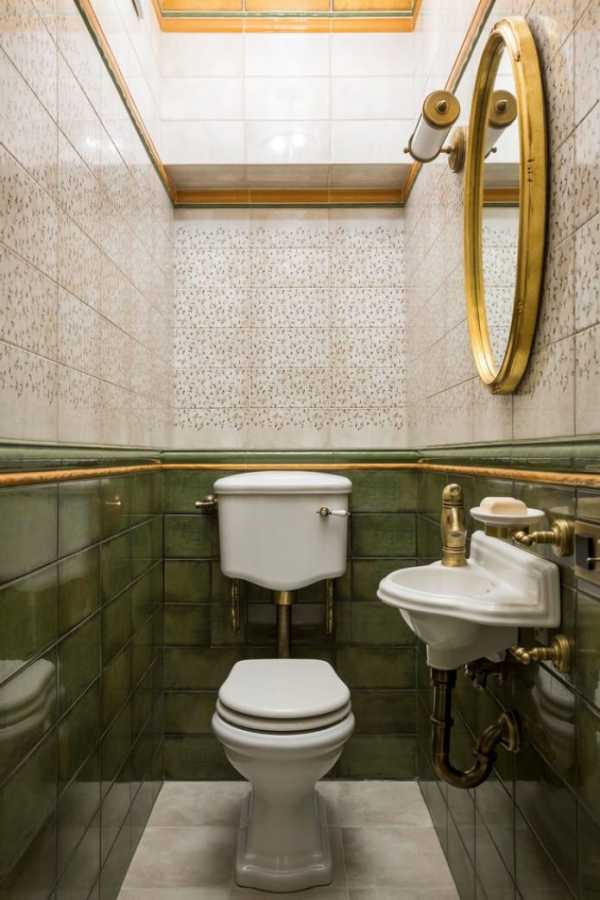 На этом фото приведен пример классического туалета с раскинутыми по всему периметру декоративными бордюрами, словно разделяющими стену на две части. Такие бордюры, или как их следует называть правильнее — фризы, вносят в помещение легкий оттенко самобытности и отлично подчеркивают индивидуальность хозяина.
