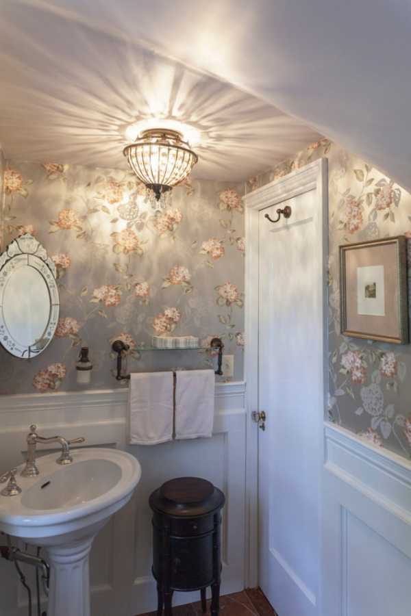 Интерьер туалета в стиле прованс бывает бело-зеленым, бело-лиловым. Обои выбираются с изображением цветов или в полоску. Шкафчик над туалетом сделан в прованском стиле и покрашен в пастельный зеленый цвет.