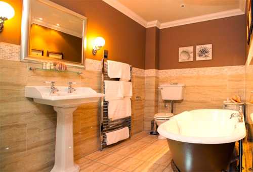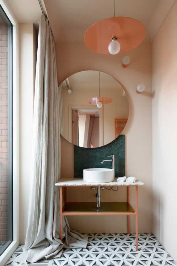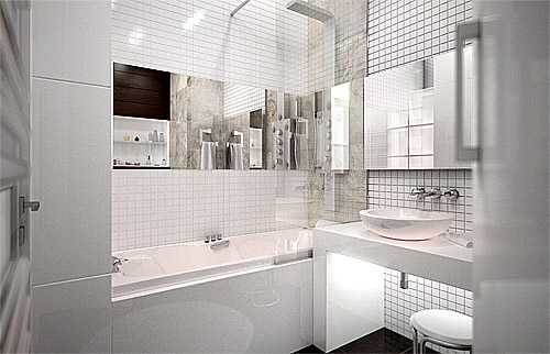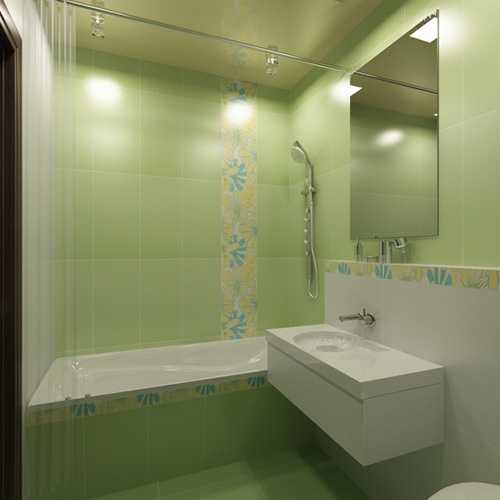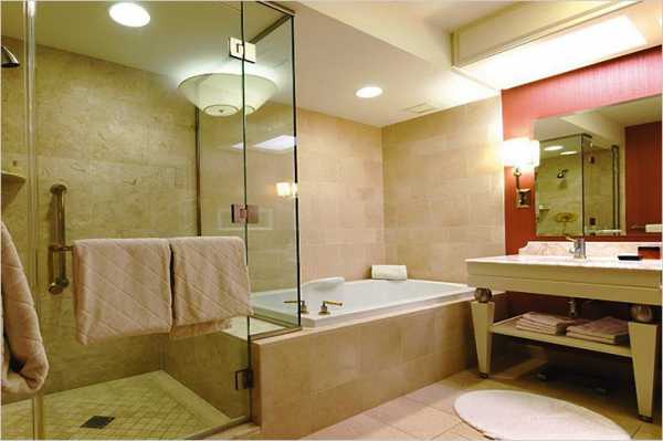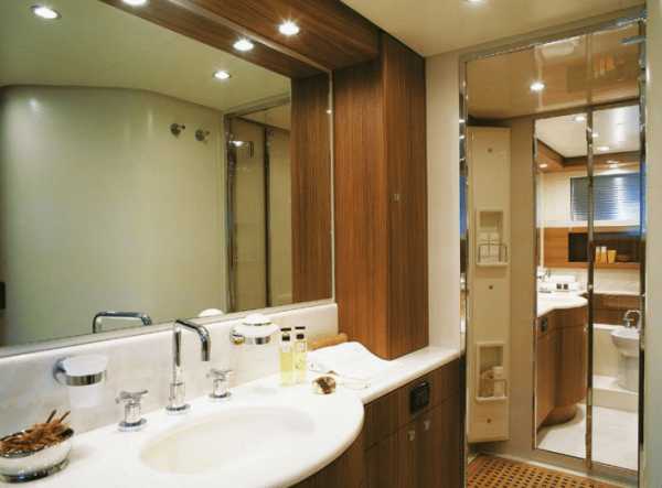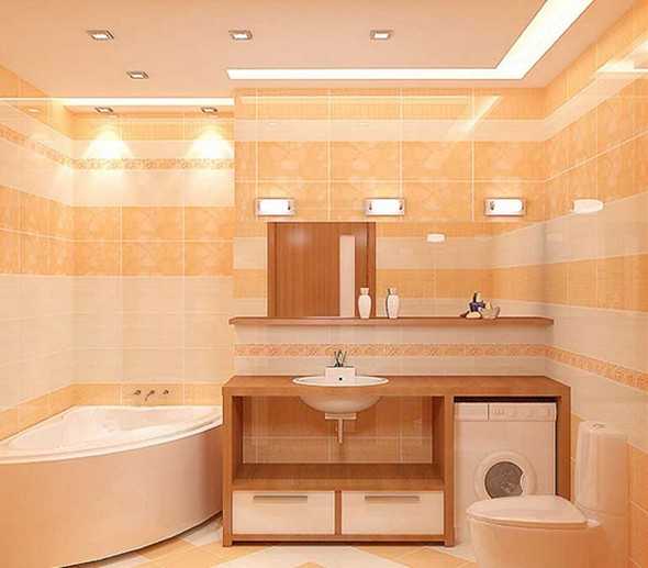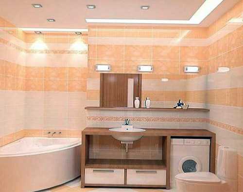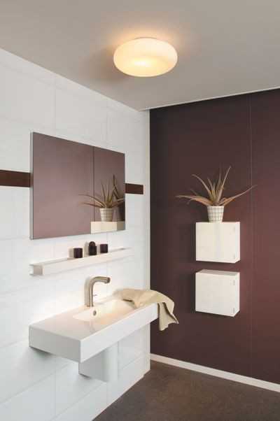 В большом помещении выполняется зонирование, позволяющее для каждой процедуры выделить автономный участок. В этом случае предусматривается индивидуальное освещение для каждой зоны. В маленьких комнатах главные осветительные приборы обычно размещаются на полотке, в верхней части стен. Но должны быть дополнительные светильники в зоне размещения зеркала. В противном случае будет сложно бриться, выполнять косметические процедуры.